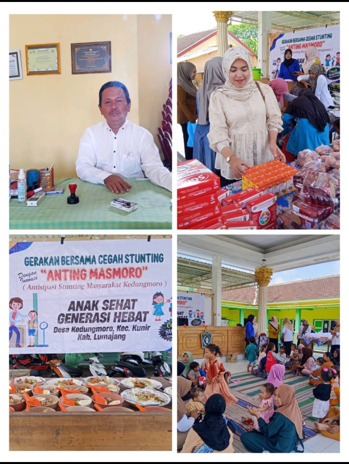 LUMAJANG || Pemerintah Desa Kedungmoro terus berupaya menekan angka stunting di wilayahnya melalui program rutin bernama “Anting Masmoro” (Antisipasi Stunting Masyarakat Kedungmoro). Kegiatan ini didanai dari Dana Desa (DD) dan dilaksanakan setiap tiga bulan sekali di pendopo balai desa, dengan melibatkan berbagai pihak terkait.