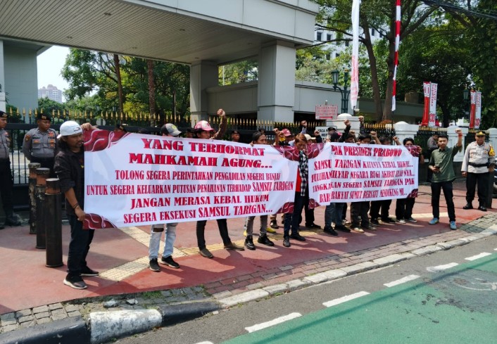 “Pak Presiden Prabowo. Samsul Tarigan katanya kebal hukum, puluhan miliar negara rugi akibat ulahnya. Tangkapkan segera Samsul Tarigan Pak. Barisan rakyat sumut bersatu mendukung mu,” tulis spanduk yang digelar di depan gedung Mahkamah Agung.