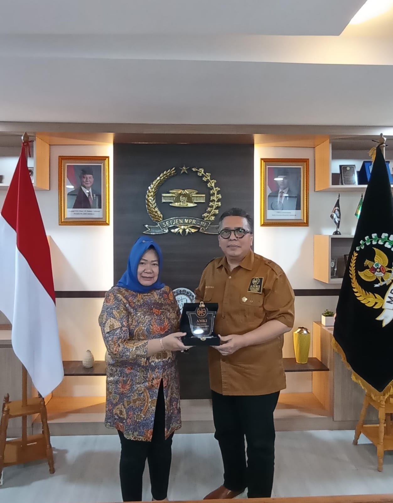 Sebagai bentuk apresiasi, Pengurus AMKI Pusat menyerahkan plakat kenang-kenangan kepada Sekjen MPR RI, Siti Fauziah. Penyerahan dilakukan langsung oleh Ketua Umum AMKI Pusat, Tundra Meliala, didampingi jajaran pengurus lainnya.