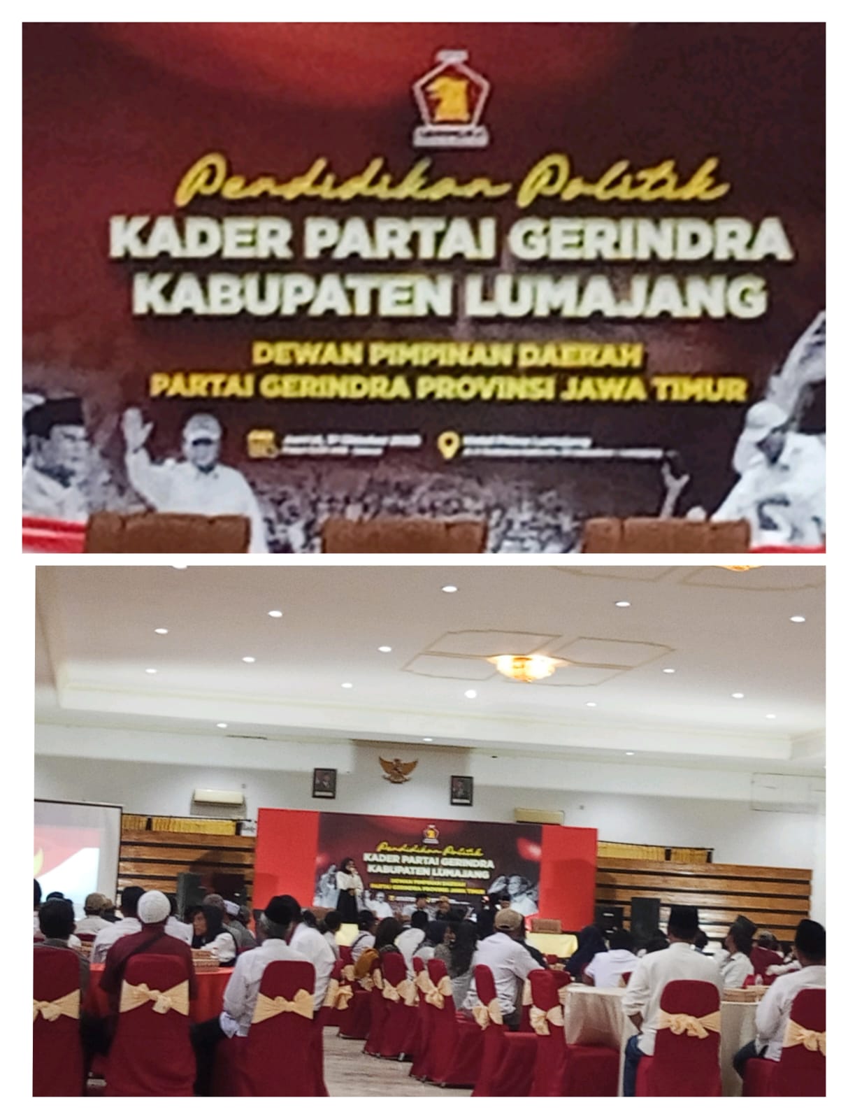 LUMAJANG || Dewan Pimpinan Daerah (DPD) Partai Gerindra Jawa Timur menggelar pendidikan politik yang diikuti oleh 150 kader di Kabupaten Lumajang. Acara yang berlangsung di Aula Hotel Prima Sukodono ini menghadirkan sejumlah tokoh penting, termasuk bapak Athoillah dan Ustadz Rahmatullah sebagai pemateri.