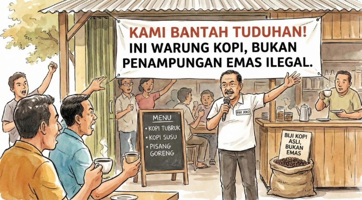 AT menjelaskan, warung kopi yang ia kelola di Pasar Melawi merupakan usaha legal yang bergerak di bidang kuliner dan tempat berkumpul masyarakat. Menurutnya, tidak pernah ada aktivitas jual beli ataupun penampungan emas ilegal seperti yang dituduhkan. “Warung kopi saya murni usaha kuliner. Tidak pernah ada transaksi emas, apalagi penampungan emas ilegal,” ujarnya.