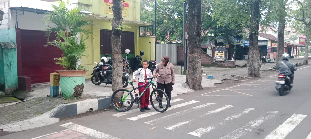 Anggota Polres Lumajang Saat Menyeberangkan Pelajar dan Mengatur Lalu Lintas