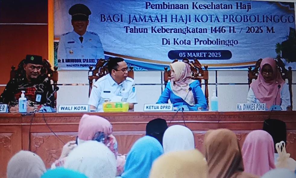 KOTA PROBOLINGGO || Pemerintah Kota Probolinggo melalui Dinas Kesehatan, Pengendalian Penduduk, dan Keluarga Berencana (Dinkes PPKB) Kota Probolinggo menggelar kegiatan ‘Pembinaan Kesehatan Haji Bagi Jamaah Haji Kota Probolinggo Tahun Keberangkatan 1446 H/ 2025 M di Puri Manggala Bhakti Kantor Wali Kota Probolinggo, Rabu (5/3/25).