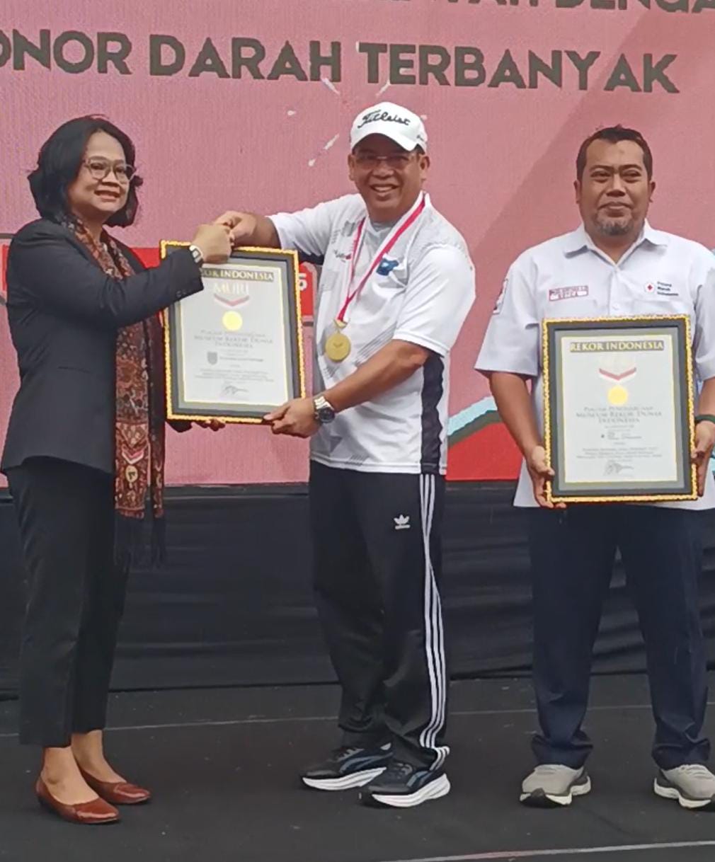 Pencatatan rekor ditandai dengan penyerahan medali dan piagam oleh Ketua MURI Semarang Ari Andriani kepada pemrakarsa Wali Kota dr Aminuddin dan penyelenggara Ketua PMI Kota Probolinggo Mega Guntara,di Alun-alun Kota Probolinggo, Jumat (23/5/2025) pagi.