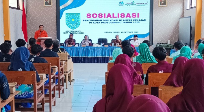 KOTA PROBOLINGGO | Sebanyak 65 siswa kelas X dan XI SMK N 1 juga OSI S SMKN 1 dan OSIS MAN I Probolinggo mengikuti kegiatan Sosialisasi Pencegahan Dini Konflik Antar pelajar yang digelar Pemerintah Kota Probolinggo melalui Badan Kesatuan Bangsa dan Politik (Bakesbangpol). Acara yang berlangsung di ruang pertemuan sekolah ini dibuka langsung oleh Wali Kota Probolinggo, dr. Aminuddin, Kamis (30/10/2025) pagi.