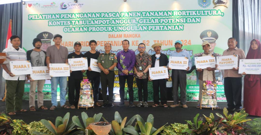 Untuk diketahui dalam gelaran tersebut juga dilakukan penyerahan piagam kepada penggemar kontes anggur dan bonsai, berikut dengan para pemenang dalam gelar potensi dan olahan produk unggulan pertanian oleh Dandim 0820/Probolinggo Letkol Arm Heri Budiasto. (Choy)
