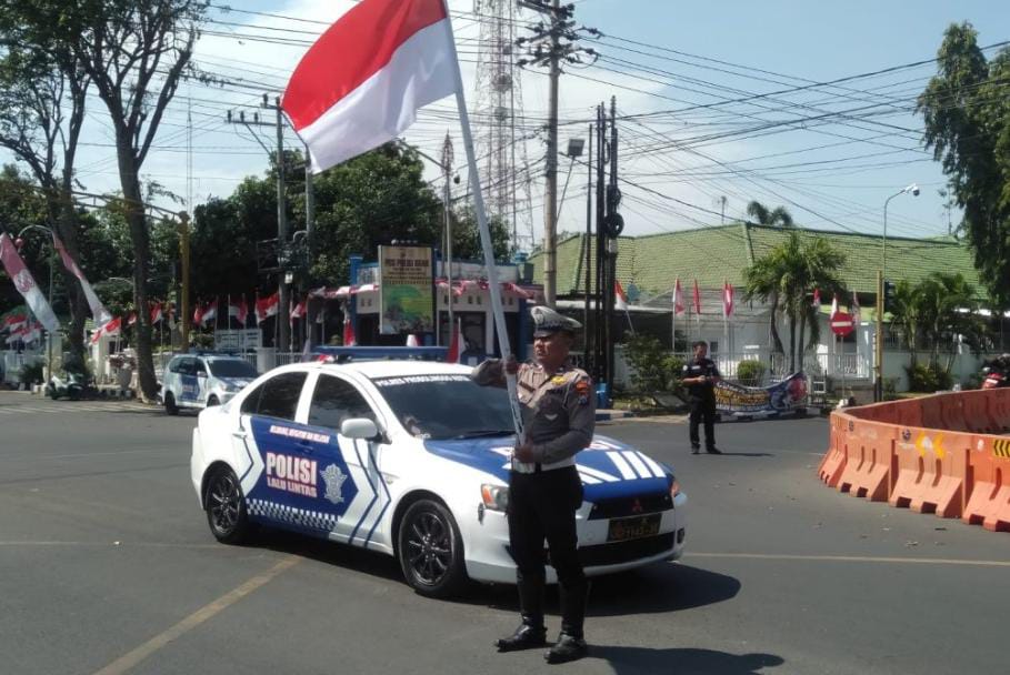KOTA PROBOLINGGO || Anggota Satlantas Polres Probolinggo Kota menghentikan semua kendaraan yang melintas di perempatan Brak (lampu Merah). Hal itu dalam rangka memperingati detik–detik Proklamasi Kemerdekaan RI ke 80, Minggu (17/8/2025) pagi.