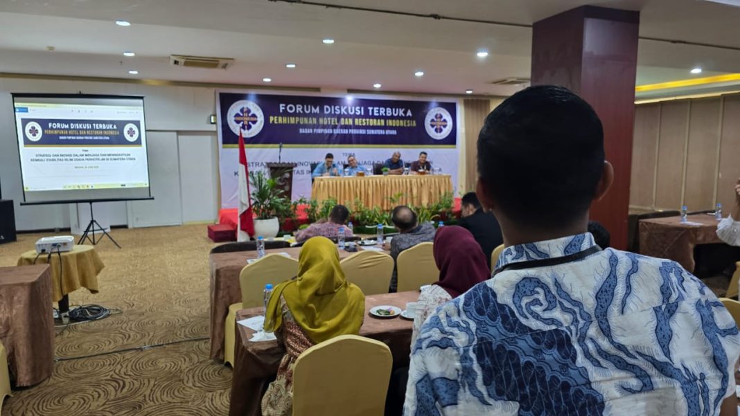 MEDAN || Perhimpunan Hotel Dan Restoran Indonesia (PHRI) Sumut Badan Pimpinan Daerah Sumut menggelar Forum Diskusi Terbuka bertema “Strategi dan Inovasi Dalam Menjaga Dan Meningkatkan Kembali Stabilitas Iklim Usaha Perhotelan Di Sumatera Utara” Jumat (20/6/2025) di Grand Kanaya Hotel. Dalam diskusi itu, Ketua PHRI Sumut Denny S Wardhana mengatakan efisiensi bukan hanya berdampak pada menurunya tingkat okupansi dan pengurangan karyawan, tapi berdampak pada pembelian bahan baku makanan yang melibatkan UMKM.