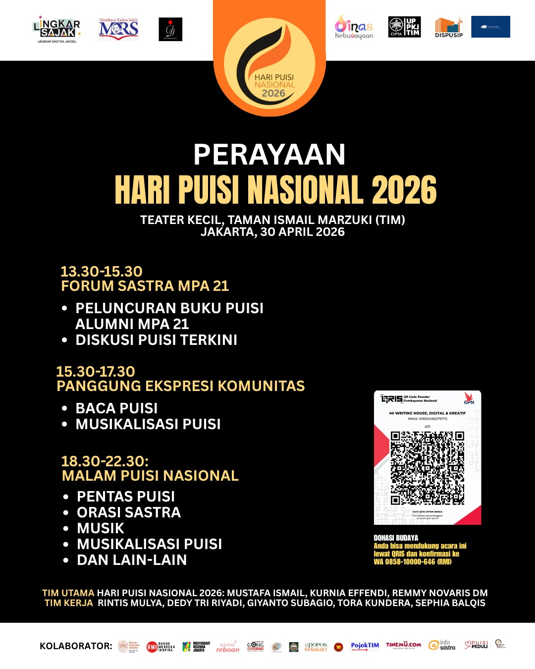 Acara hari puisi nasional 2026 ini melibatkan para penyair-penyair besar di tanah air yang merayakan di berbagai daerah dan puncaknya diselenggarakan di daerah khusus Jakarta tepatnya di Taman Ismail Marzuki.
