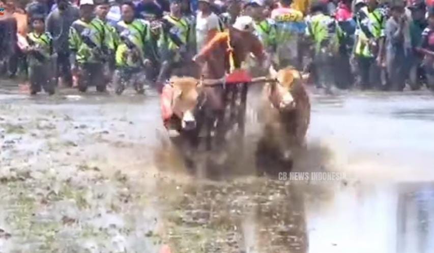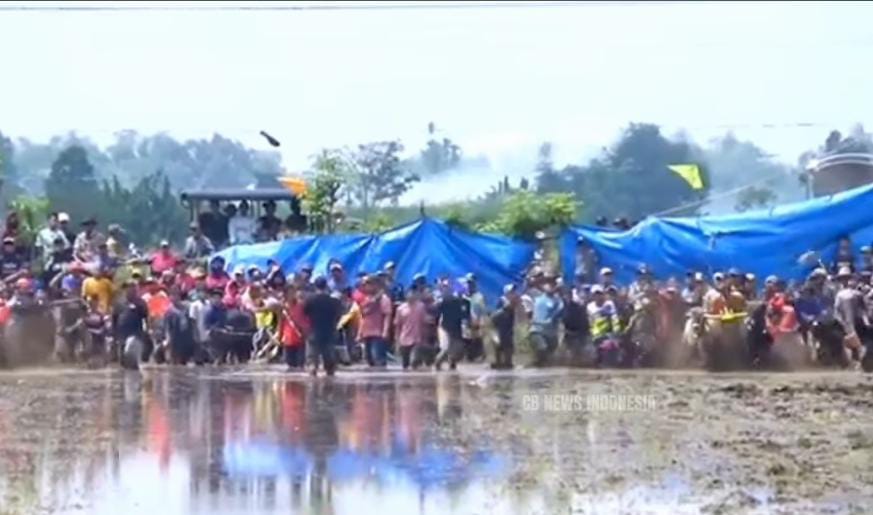 Sejak pagi hari, jejak kaki sapi yang membelah lintasan berlumpur dengan antusiasme penonton menjadi tontonan yang paling dinantikan.