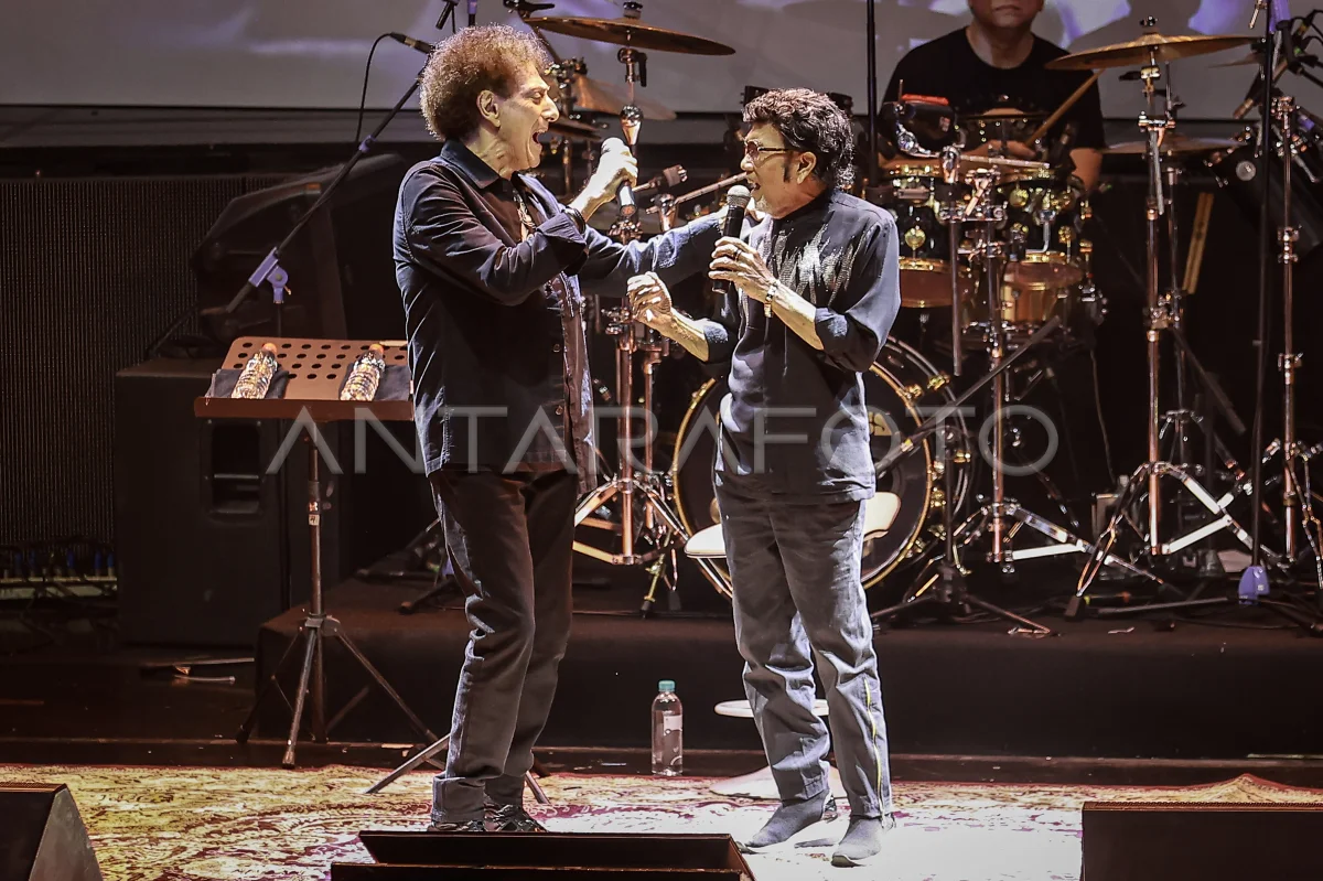 Malam itu, God Bless mengajak penonton menyusuri lorong waktu, dari era Deep Purple hingga kisah sepatu panggung yang copot. Albar, yang akrab disapa Iyek, membuka malam dengan sapaan bersahaja. “Kita santai aja malam ini, banyak ngobrol, banyak cerita,” ujarnya.