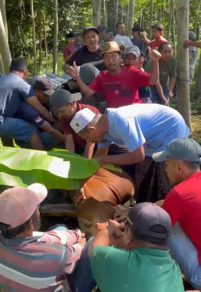 Penyembelian hewan qurban dilaksanakan di depan rumahnya dusun Bringinan, desa Ranubedali, Kecamatan Ranuyoso, Kabupaten Lumajang, Jumat (6/6/2025).