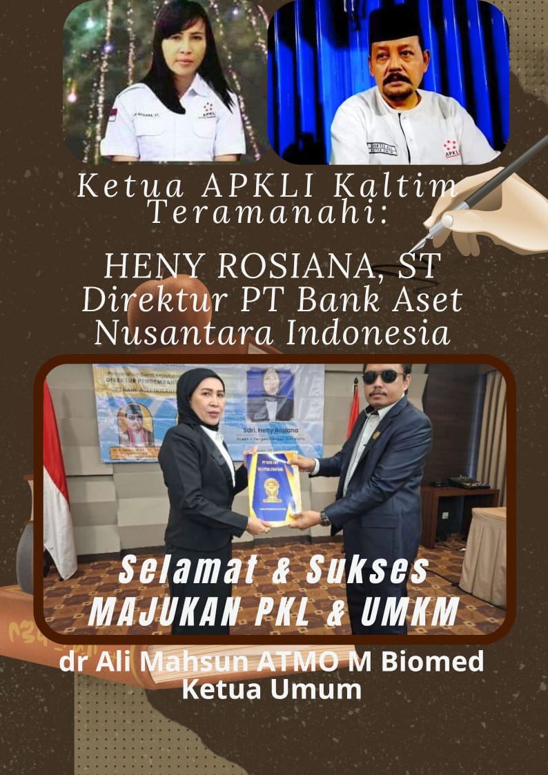 Keluarga besar Asosiasi PKL Indonesia beserta PKL dan UMKM mengucapkan Selamat dan sukses Sdr Heny Rosiana, ST, Ketua DPW Asosiasi PKL Indonesia Kaltim atas amanah Direktur Pengembangan dan Bisnis PT Bank Aset Nusantara Indonesia. Bangun sinergi dan kolaborasi, serta majukan PKL dan UMKM mampu unggul hantarkan Indonesia sukses jemput puncak bonus demografi 2030. Lebih dari itu, lakukan pendampingan setiap kucurkan kredit modal untuk PKL dan UMKM diseluruh Indonesia, pungkas dokter ahli kekebalan tubuh alumni FK Unibraw Malang dan FKUI Jakarta yang sudaj 14 tahun sejak 2011 dampingi PKL dan UMKM