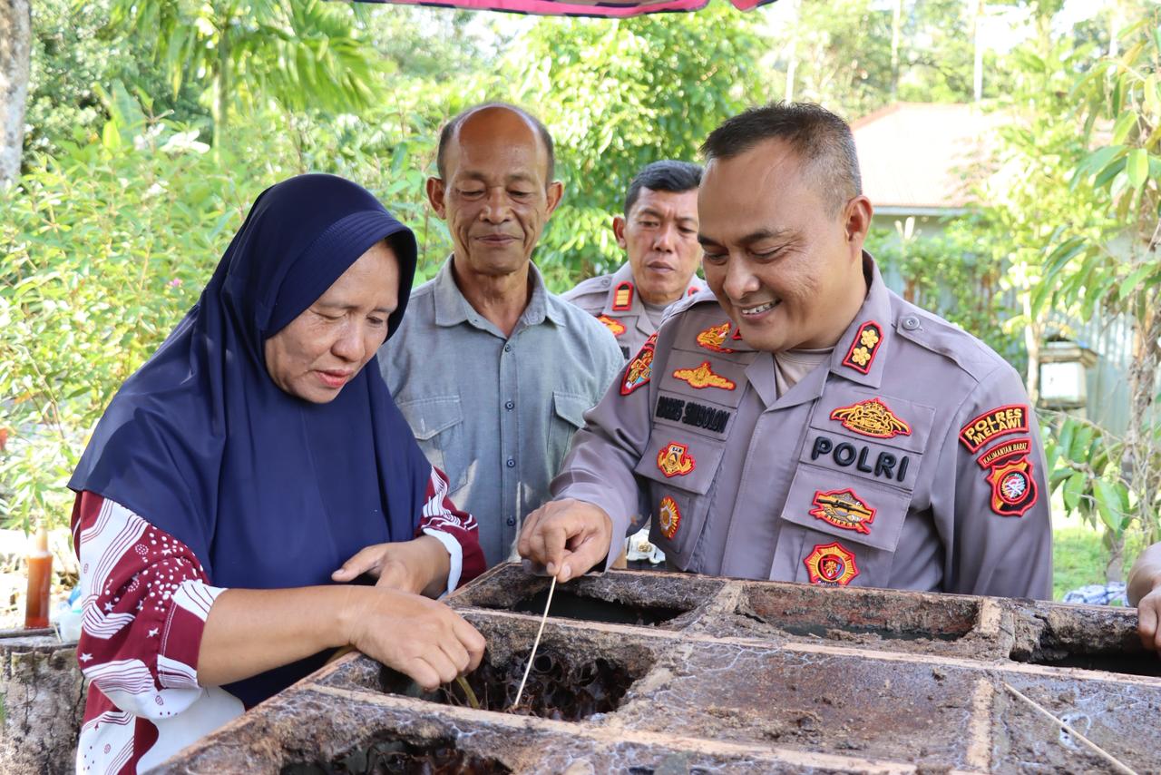 Dalam kunjungan ini, Kapolres Melawi turut merasakan langsung pengalaman memanen madu kelulut, mulai dari proses penyedotan madu pada log sarang hingga merasakan keasliannya.