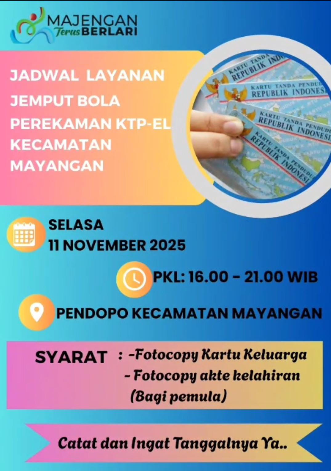 KOTA PROBOLINGGO || Dalam rangka meningkatkan pelayanan publik dan mempermudah akses bagi masyarakat, Kecamatan Mayangan, Kota Probolinggo membuka layanan jemput bola untuk pembuatan dan perpanjangan e-KTP. Kegiatan ini dijadwalkan dimulai pada hari Selasa, 11 November 2025, mulai dari pukul 16.00 – 21.00 WIB, lokasi di kantor Kecamatan Mayangan.