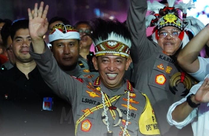 Kapolri tampak didampingi oleh para Pejabat Utama Mabes Polri. Kehadirannya menjadi perhatian besar masyarakat, terutama karena penampilannya yang unik. Meski mengenakan seragam lengkap Kepolisian, Jenderal Listyo turut membalut diri dengan atribut adat Papua berupa penutup kepala bulu, kalung etnik, serta rok rumbai. Penampilan ini sontak menjadi salah satu ikon yang menambah warna pada Karnaval Kemerdekaan sekaligus menegaskan semangat kebhinekaan.
