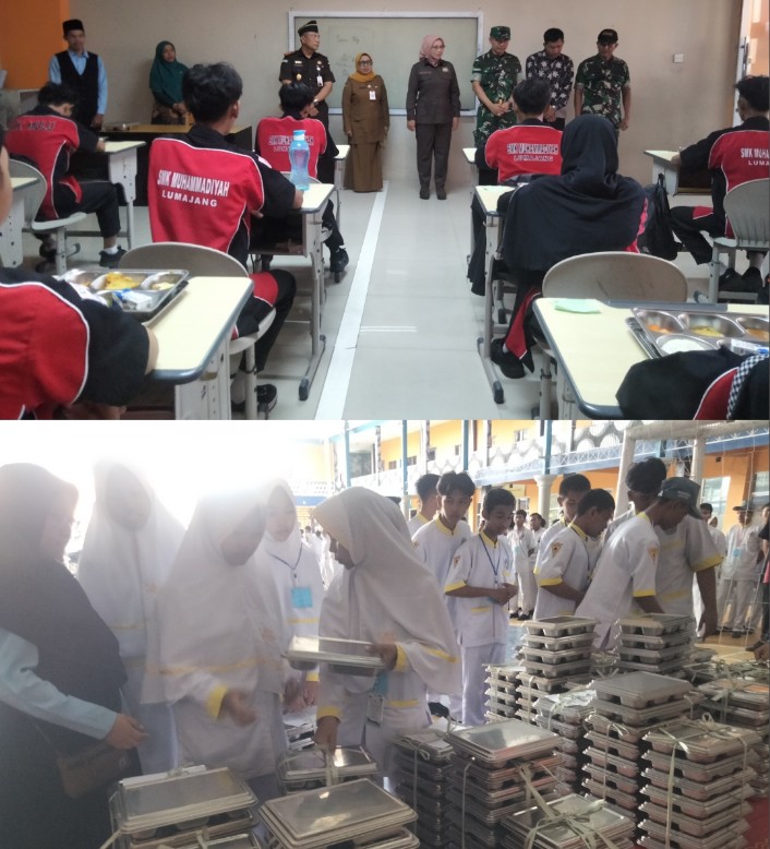 Rombongan juga meninjau ke ruang kelas, dan melihat siswa saat menikmati makan siang tersebut. Kepala sekolah SMK Muhamadiyah Lumajang Amarlian Bilqisthi Agustin, M.P.d