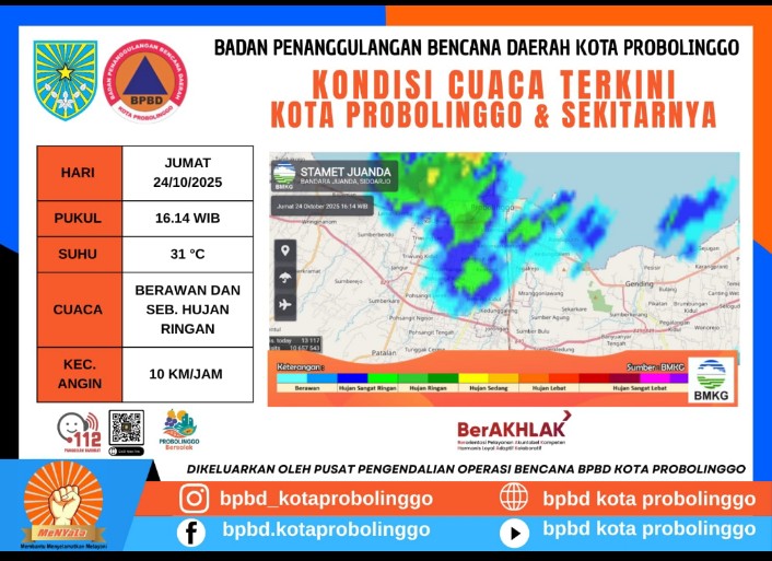 Dia menambahkan, berdasarkan rilis dari Stasiun Meteorologi Kelas I Juanda Sidoarjo BMKG. Kota Probolinggo menjadi salah satu daerah di Jawa Timur yang turut masuk dalam daftar imbauan waspada akan terjadinya bencana akibat cuaca ekstrem, seperti hujan lebat, banjir, tanah longsor, puting beliung dan angin kencang.