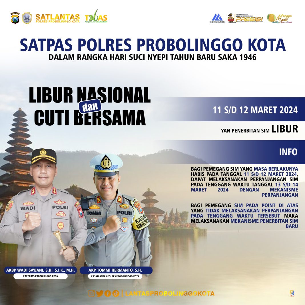 Kepala Satuan Lalu Lintas (Kasatlantas) Polres Probolinggo Kota,AKP,Tommi Hermanto melalui Baur SIM,Aipda Agus Effendi SH menyampaikan bahwa penutupan layanan ini dilakukan sejalan dengan libur nasional Nyepi. “Kami akan memulai kembali layanan pada 13 Maret,” ujarnya.
