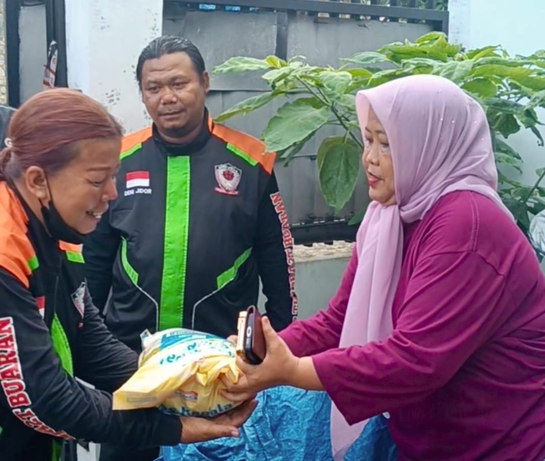 Pemimpin Redaksi Media Sudut Pandang, Umi Sjarifah memberikan paket beras ke pengemudi ojol di Buaran Jakarta Timur. Istimewa.