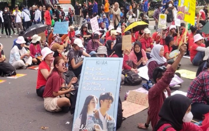 Dengan sejumlah tuntutan tersebut, menariknya terdapat salah satu poster dibawa Aksi Perempuan Indonesia yakni poster Dilan dan Milea dengan bertuliskan sebuah kalimat nyeleneh.