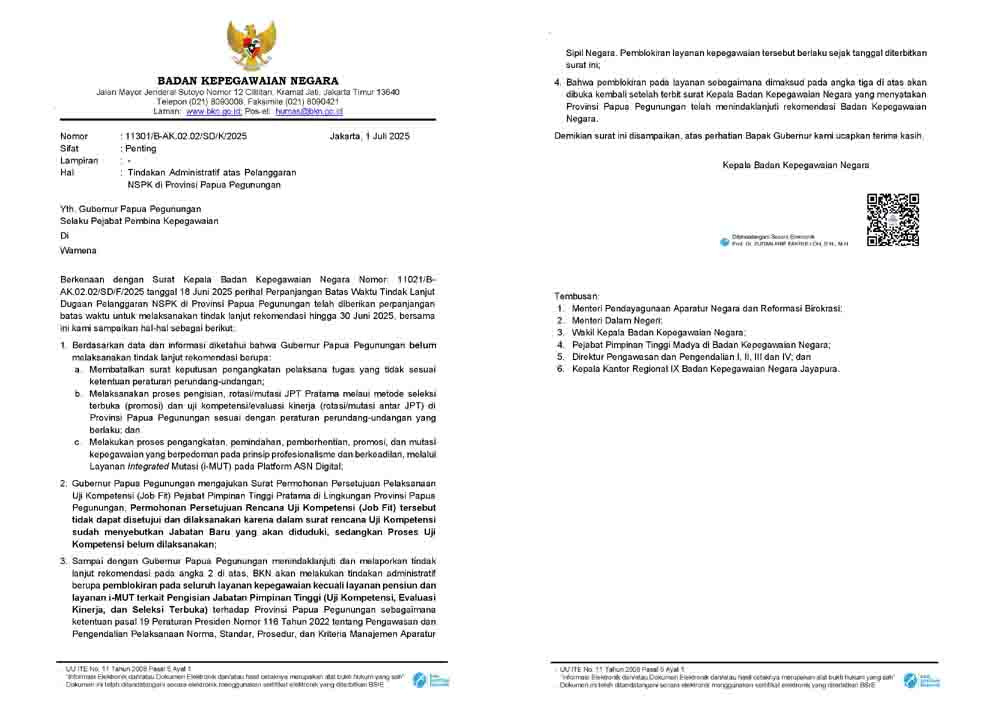 JAYAPURA | Badan Kepegawaian Negara (BKN) RI resmi memblokir seluruh layanan kepegawaian di Provinsi Papua Pegunungan terhitung sejak tanggal 1 Juli 2025.