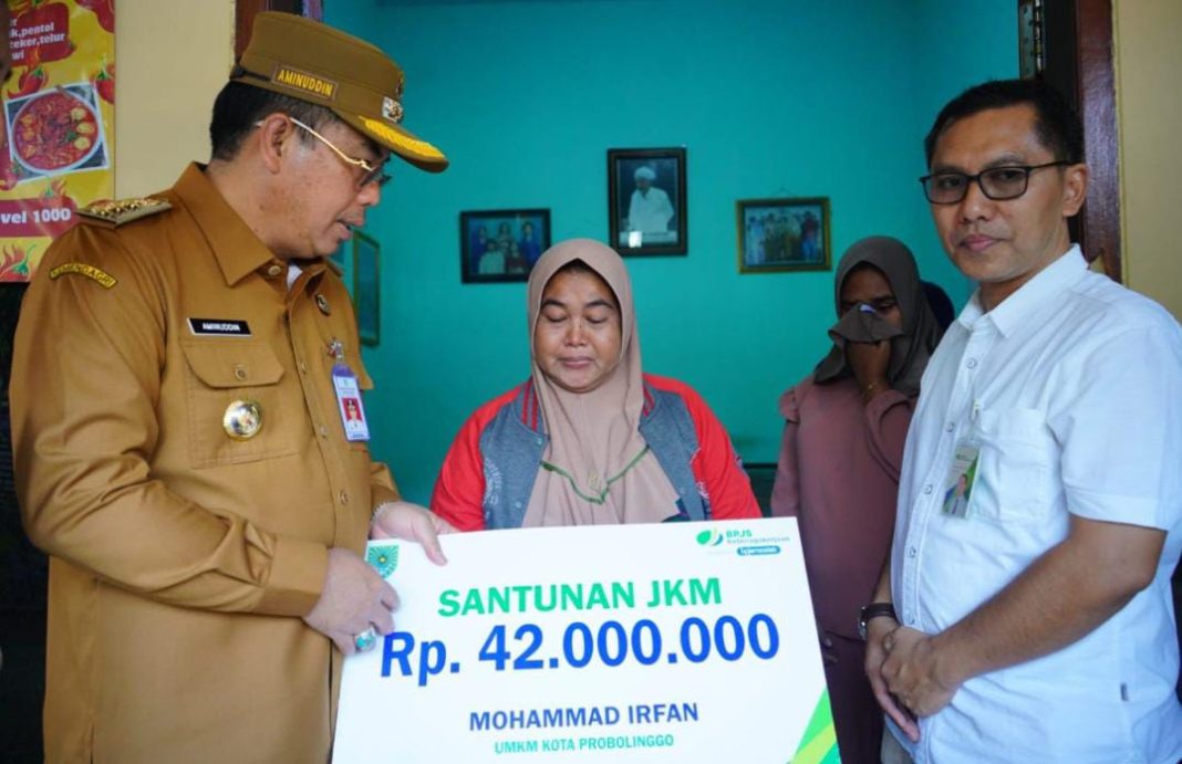KOTA PROBOLINGGO || Pemerintah Kota Probolinggo bersama Badan Penyelenggara Jaminan Sosial (BPJS Ketenagakerjaan) menyerahkan santunan jaminan kematian (JKM) kepada para ahli waris peserta aktif BPJS dari kalangan nelayan, petani dan pelaku UMKM. Santunan tersebut diserahkan secara langsung oleh Wali Kota Probolinggo dr. Aminuddin di delapan lokasi berbeda.
