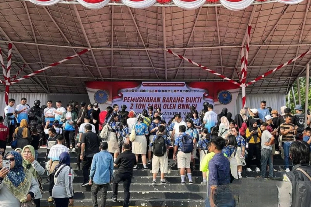 Seruan itu meluncur lantang dari tengah kerumunan saat Badan Narkotika Nasional (BNN) memamerkan barang bukti sabu seberat hampir 2 ton beserta enam tersangka dalam acara pemusnahan narkoba di Alun-Alun Batam Centre, Kamis (12/6/2025).