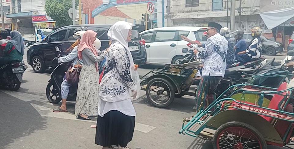 Tampak Kapolsek Mayangan Kompol Heri Sugiono bersama Ketua PGRI Kota Probolinggo Dr. Agus Lithanta bersama jajaran pengurus PGRI turun langsung ke jalan tepatnya di Pertigaan King Jalan Panglima Sudirman yang berada di Kecamatan Mayangan, Rabu (22/10/2025) pagi.