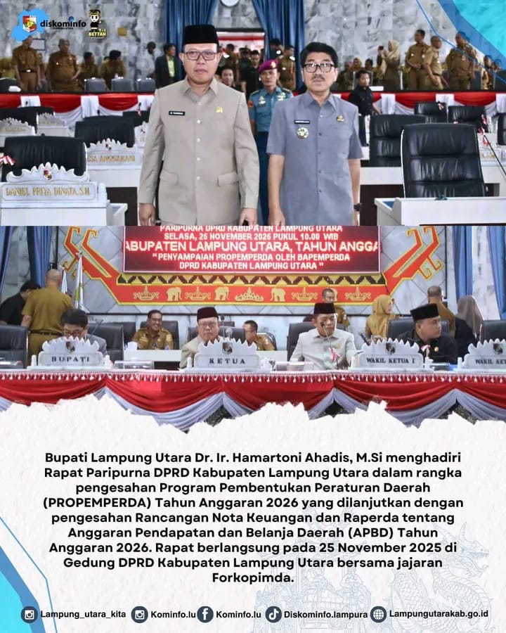 LAMPUNG UTARA || Bupati Lampung Utara Dr. Ir. Hamartoni Ahadis, M.Si menghadiri Rapat Paripurna DPRD Kabupaten Lampung Utara dalam rangka pengesahan Program Pembentukan Peraturan Daerah (PROPEMPERDA) Tahun Anggaran 2026 yang dilanjutkan dengan pengesahan Rancangan Nota Keuangan dan Raperda tentang Anggaran Pendapatan dan Belanja Daerah (APBD) Tahun Anggaran 2026. Rapat berlangsung pada 25 November 2025 di Gedung DPRD Kabupaten Lampung Utara bersama jajaran Forkopimda.
