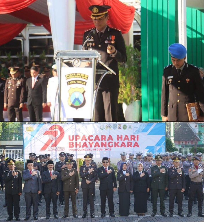 Kapolres Probolinggo Kota AKBP Rico Yumasri S.I.K. M.I.k, bertindak sebagai inspektur upacara menyampaikan bahwa peringatan Hari Bhayangkara merupakan momentum untuk merefleksikan pengabdian Polri kepada masyarakat.