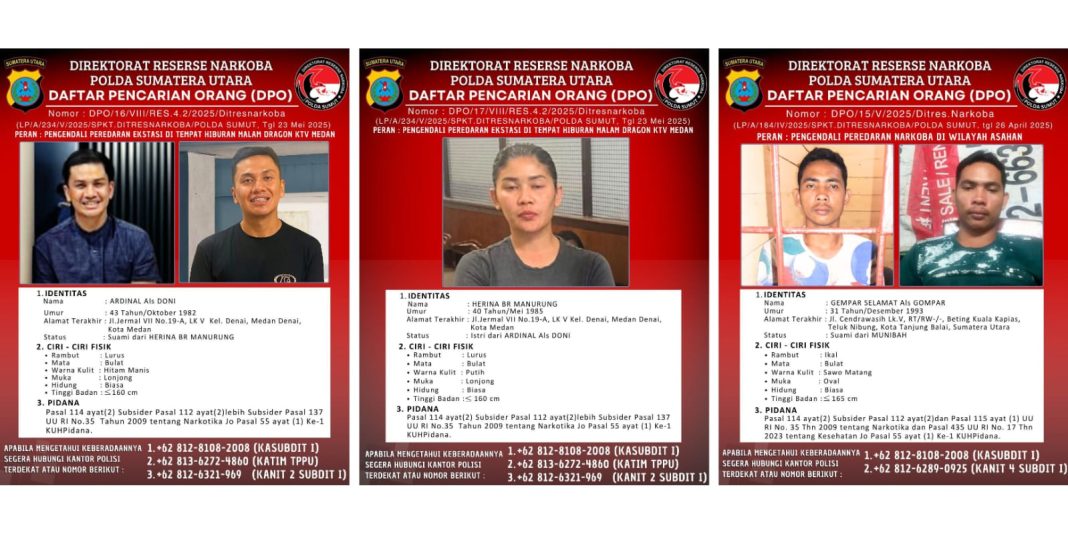 MEDAN || Pasangan Suami istri (Pasutri) pemilik tempat hiburan malam Dragon KTV di Medan Ardinal alias Doni (43) dan Herina br Manurung (40), yang berdomisili di Jalan Jermal VII, Medan Denai resmi ditetapkan masuk sebagai Daftar Pencarian Orang (DPO) oleh Ditresnarkoba Polda Sumut. Petugas Juga menetapkan DPO terhadap Gempar Selamat alias Gompar (31), warga Jalan Cendrawasih, Kelurahan Beting Kuala Kapias, Kecamatan Teluk Nibung, Kota Tanjung Balai, Selasa (2/9/2025).