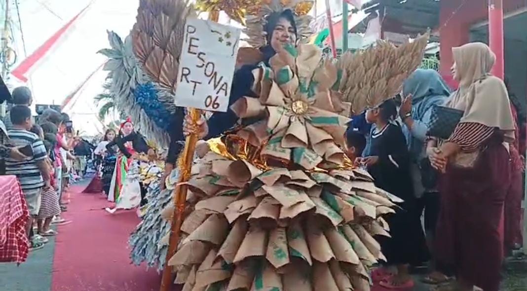 Sorotan utama sore itu adalah fashion show kostum daur ulang sampah. Dengan alunan musik yang meriah, para peserta yang berasal dari warga RT 01 hingga RT 07 memamerkan kostum buatan sendiri di atas catwalk.