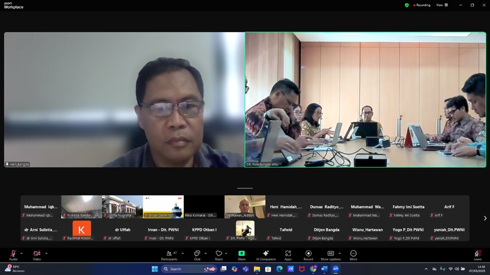 Pertemuan yang berlangsung Jum’at, 7 Maret 2025, dipimpin oleh Direktur Pelindungan WNI Kemlu dan dihadiri oleh Asdep Koordinasi dan Kerja Sama Asia, Pasifik dan Afrika, Asisten Deputi Pemenuhan Hak, Pelindungan dan Pemberdayaan Perempuan Kemenko PMK, Direktur Kepulangan dan Rehabilitasi KP2MI, Direktur Jaminan Sosial Keluarga Kemensos serta pejabat/perwakilan dari Kementerian Imigrasi dan Pemasyarakatan, KJRI Jeddah, Balai Besar Kekarantinaan Kesehatan Soekarno Hatta, Polres Soekarno Hatta, BP3MI Banten dan Ditjen Bina Pembangunan Daerah Kemendagri.