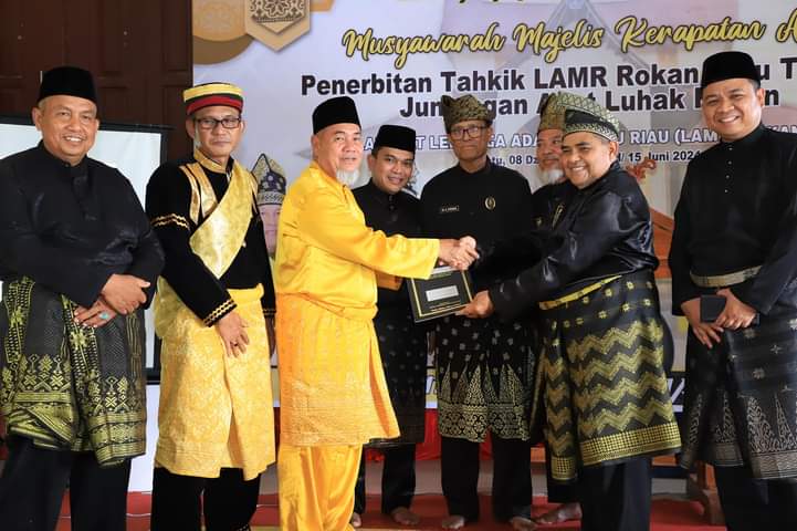 Tahkik Nomor: 01/MKA-DPH/LAMR-RH/VI/2024 Lembaga Adat Melayu Riau Rokan Hulu tentang Pengakuan dan Penetapan Junjungan Adat Sebagai Raja Luhak Rokan tertanggal 15 Juni 2024 itu diserahkan oleh Ketua Umum DPH LAMR Rohul, Dt. Seri H. Zulyadaini, Gelar Datuk Saudagar Rajo.