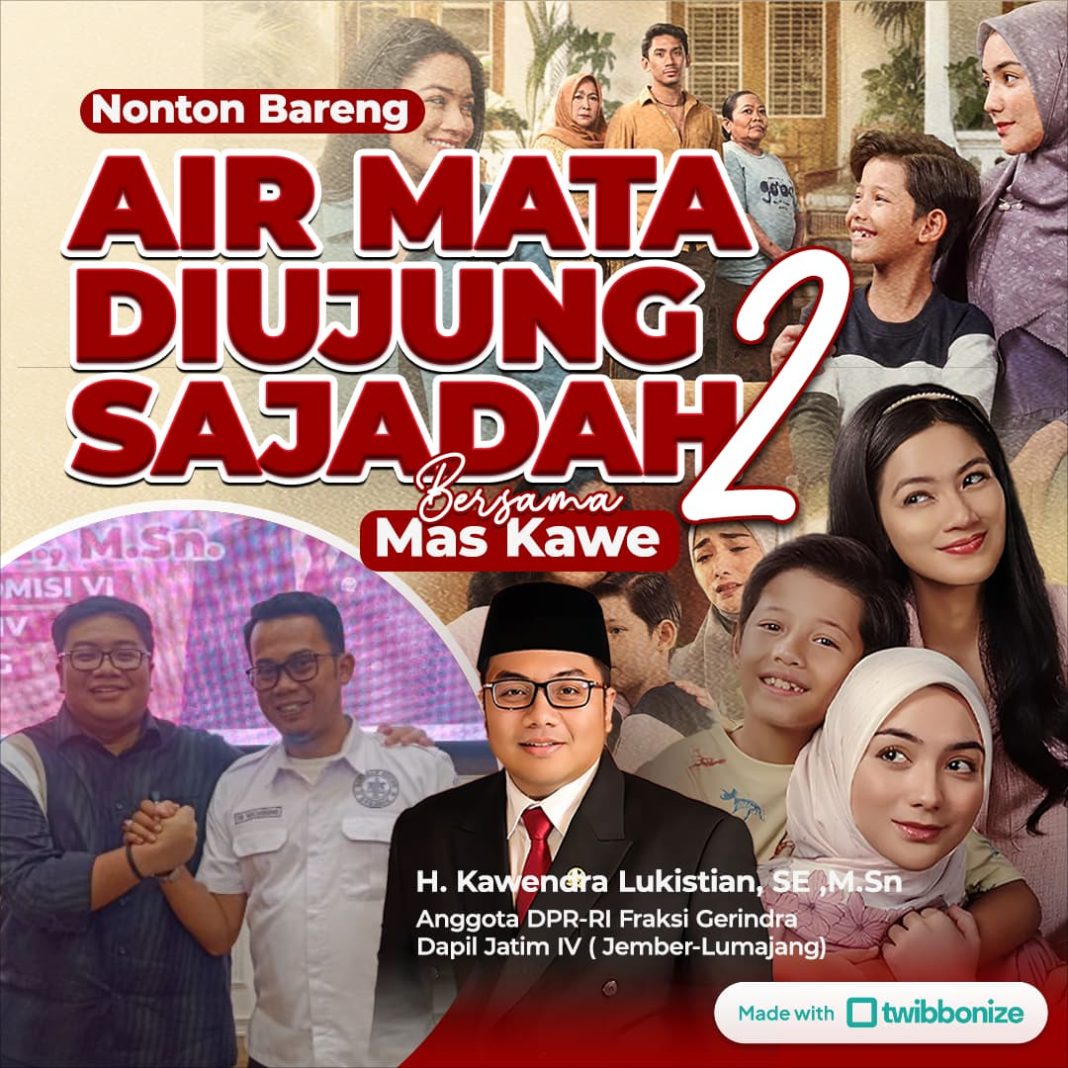 Mas Kawe, yang membidangi perdagangan, perindustrian, investasi, koperasi UKM dan BUMN, serta standarisasi nasional di Komisi VI DPR RI, menyampaikan bahwa “kegiatan ini merupakan wujud kecintaannya terhadap karya anak bangsa. “Film ‘Air Mata di Ujung Sajadah 2’ ini adalah contoh karya yang sangat menyentuh dan memiliki pesan moral yang kuat. Saya berharap, melalui film ini, kita semua semakin menghargai dan mencintai keluarga,” ujarnya.
