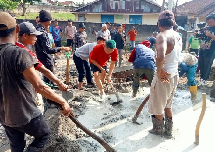 Suasana gotong royong kali ini terasa berbeda dengan kehadiran konten kreator populer, Bang Taun. Tidak sekadar berkunjung, Bang Taun terjun langsung ke lapangan, memegang sekop, dan ikut mengaduk campuran semen, pasir, serta batu bersama warga.