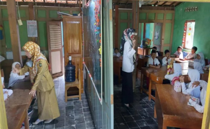 Selain ruang kelas sempit, siswa juga harus berbagi tempat duduk. Satu ruang dipakai untuk dua kelas yang hanya dibatasi sekat tipis.