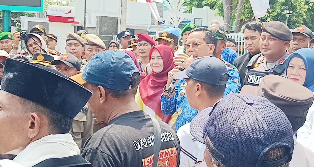 Bersama Wawali Ina Dwi Lestari, Ketua DPRD Dwi Laksmi Shynta Kusumawardhani dan Wakil Ketua DPRD Santi Wilujeng Prastiyani serta perwakilan forkopimda, Walikota dr Aminuddin menemui mereka di depan kantor kemudian mengundang perwakilan masuk ke lobi untuk berdialog.