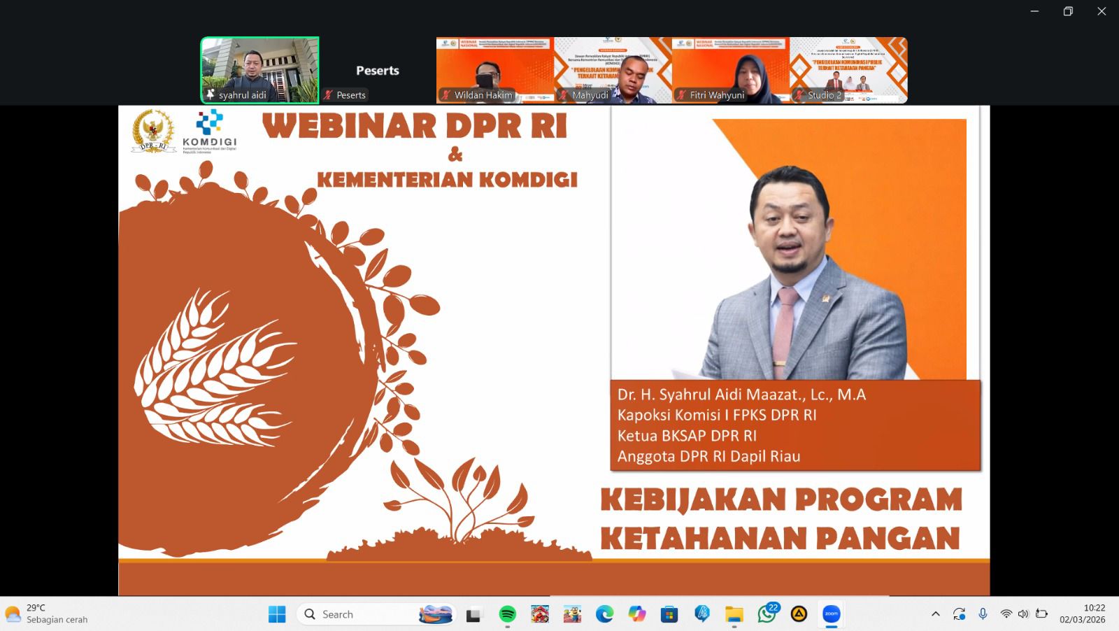 JAKARTA || Penguatan ketahanan pangan nasional tidak hanya membutuhkan kebijakan dan produksi yang memadai, tetapi juga strategi komunikasi yang efektif. Hal tersebut mengemuka dalam webinar bertema “Pengelolaan Komunikasi Publik Terkait Ketahanan Pangan” yang digelar pada Senin, 2 Maret 2026, hasil kolaborasi Direktorat Jenderal Komunikasi Publik dan Media (Ditjen KPM) Kementerian Komunikasi dan Digital bersama Komisi I DPR RI.